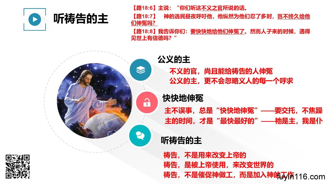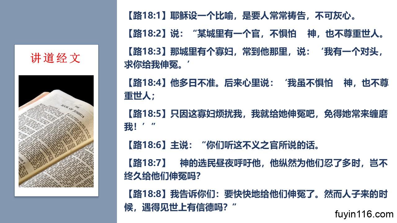 关于祷告,主耶稣讲了一个“穷寡妇和不义的官”的比喻。