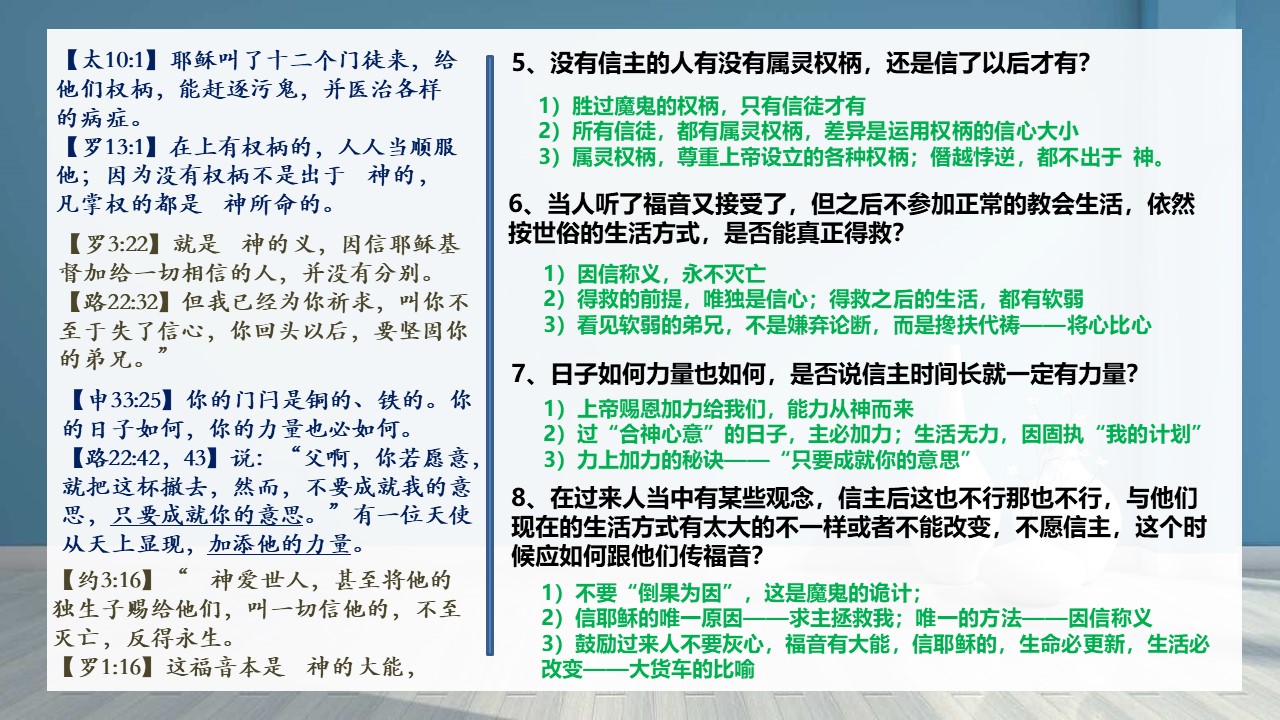 8、或者之前的一些教导,在过来人当中有某些观念,信主后这也不行那也不行,与他们现在的生活方式有太大的不一样或者不能改变,不愿信主,这个时候应如何跟他们传福音?