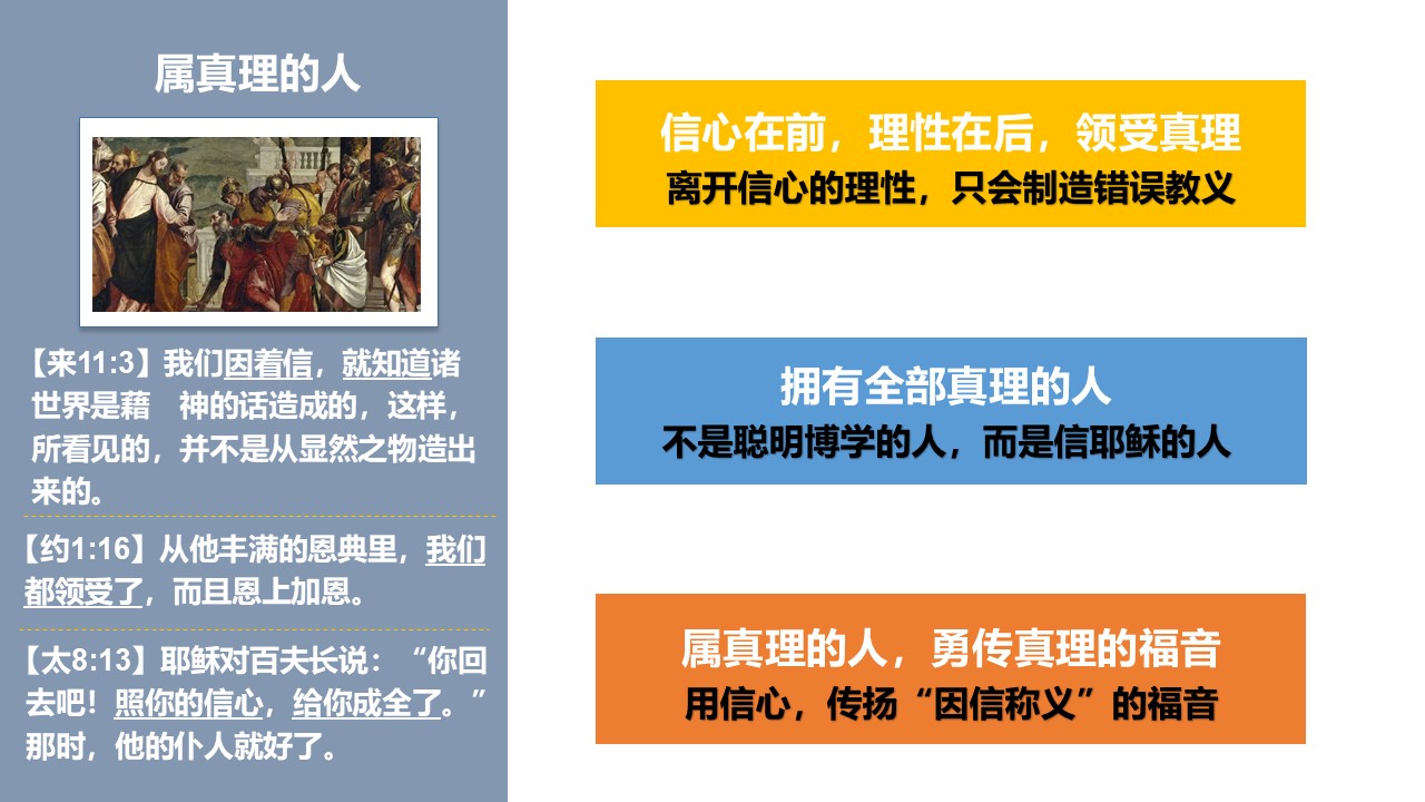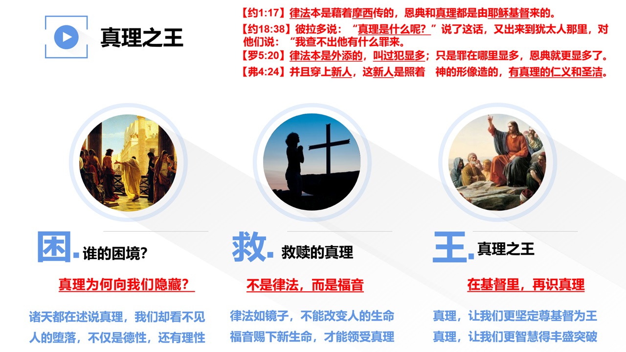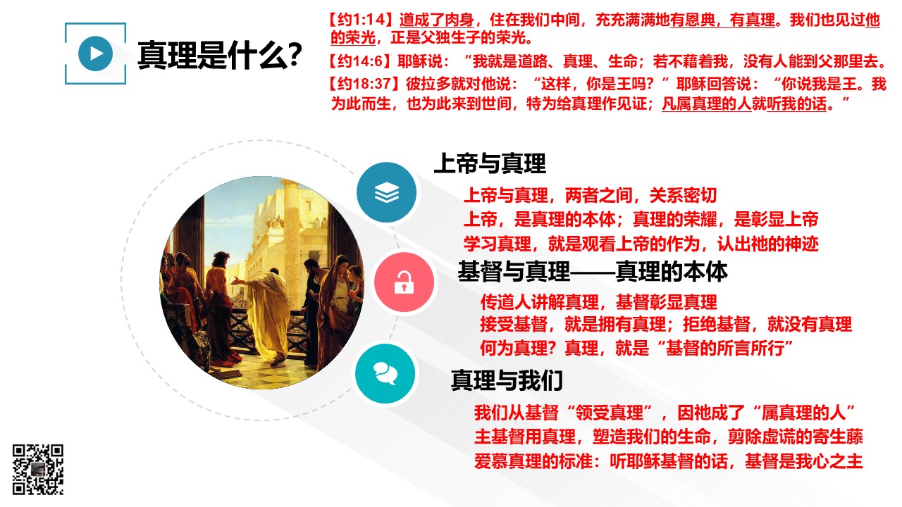“道成肉身”的基督,称为“充充满满地有恩典,有真理”,主基督的话语里,也多次提及真理。