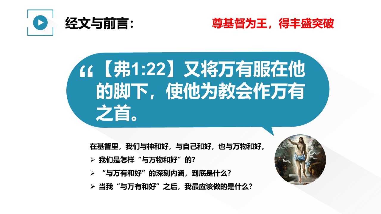 基督来了,让“ 神人和好”,让我们真正“与自我和解”,也带来了我们与“万有和好”。