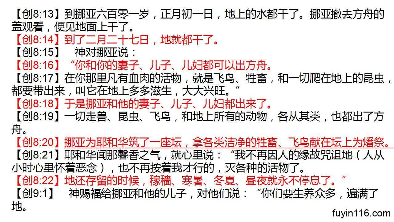 【创8:20】挪亚为耶和华筑了一座坛,拿各类洁净的牲畜、飞鸟献在坛上为燔祭。