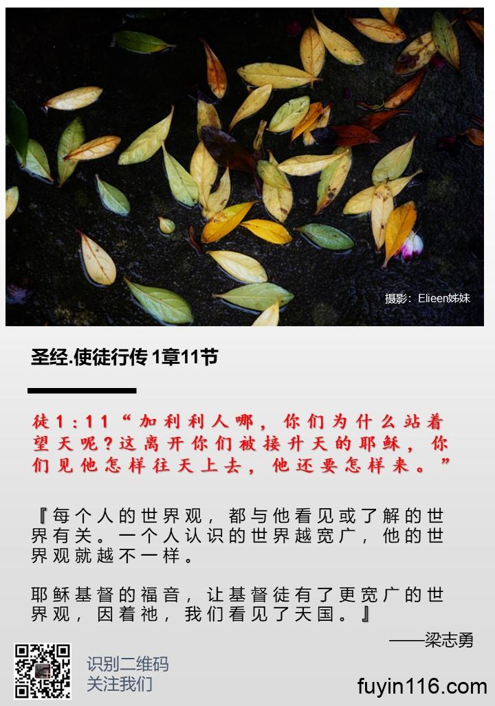 徒1:11“加利利人哪,你们为什么站着望天呢?这离开你们被接升天的耶稣,你们见他怎样往天上去,他还要怎样来。” 《全新的世界观》 作者:梁志勇牧师 朗诵:倩文师母 全新的世界观 (梁志勇) 徒1:11“加利利人哪,你们为什么站着望天呢?这离开你们被接升天的耶稣,你们见他怎样往天上去,他还要怎样来。” 每个人的世界观,都与他看见或了解的世界有关。一个人认识的世界越宽广,他的世界观就越不一样。 就如我们的成语故事“井底之蛙”告诉我们的那样,坐在井底的青蛙,以为天只是井口那么大,飞鸟却知道天大得无边。 同样…